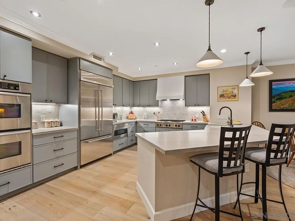 A must see! Stunningly fully remodeled single-level condo in the heart of La Jolla Village! Experience coastal luxury living at the highly acclaimed Montefaro gated community! This exceptional residence seamlessly combines spacious elegance with an unbeatable location! Close to amazing restaurants, boutiques, and beaches! You will fall in love with the stunning spacious open-concept chef kitchen and the adjacent bar area that adds a touch of sophistication, making it ideal for entertaining! Lots of natural Light! Gorgeous wood floors flow seamlessly throughout, enhancing the warm and inviting ambiance. Enjoy your own private patio, a perfect retreat for al fresco dining or morning coffee. Indulge in spa-like luxury every day in the breathtaking primary bathroom & bedroom! Designed for ultimate relaxation, this serene retreat features a stunning walk-in shower with sleek finishes and a luxurious soaking tub perfect for unwinding. Just minutes away from the pristine beaches that define Southern California. Enjoy lavish amenities such as a sparkling pool, spa, clubhouse, fitness room, sauna, and a delightful BBQ area with ocean views! Montefaro offers a manicured living environment with easy access to everything the Village has to offer. Cable fees are optional and not included in HOA fees. Parking spaces: 112 and 113. Large storage space #4. 1 pet per unit allowed.