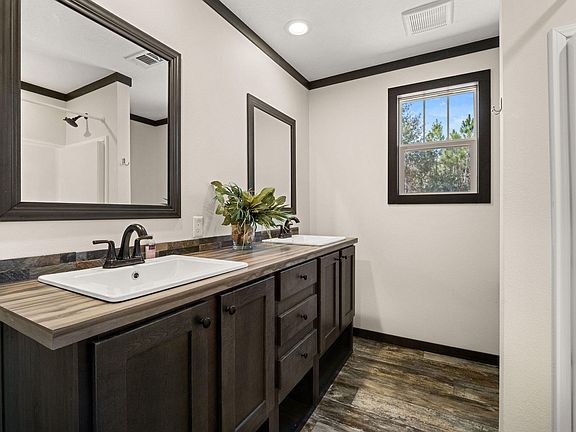 Welcome home to this 2025 double wide manufactured home nestled in the peaceful countryside within the East Beauregard School District! This 3-bedroom, 2-bathroom home perfectly blends modern comfort with farmhouse charm, featuring an inviting open layout ideal for both relaxing and entertaining. The spacious kitchen boasts stylish finishes and plenty of counter space, while the living area offers a cozy atmosphere with room for everyone to gather. The primary suite is a true retreat with a walk-in shower, soaker tub, and double sinks for added luxury. Outside, enjoy 3.38+/- acres of country serenity with plenty of space for a garden, animals, or simply soaking in the peaceful views. An outdoor shower and a Connex for storage are an added convenience on this beautiful property!