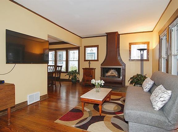 This charming bunglaow brings you hearth and home. Hardwood floors, crown moldings, stained glass and natural woodwork are some of the homes features. The living room is flanked by a wood bunring fireplace and flat screen tv will stay. Separate dining room, 2 bedrooms, full bath, kitchen and breakfast room, and 3 seasons enclosed front porch complete the main floor. Kitchen has maple cabinets and stainless steel appliance with good storage. Upstairs is a wonderful master suite. The baths are newer with white ceramic tile. There are many new windows, a new furnace in 2016, and overhead sewer and water heater are new in 2012 and the 2 car garage is from 2010. There's also a parking pad and the fence slides to accommodate a vehicle. The semi-finished basement is a fantastic rec room/family room and could easier be more finished. Great area, walk to Hatch school and Taylor Park.