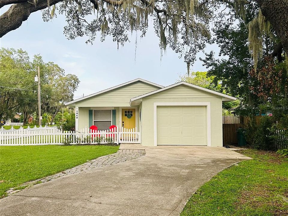 Located in Mount Dora's Historic District, you will fall in love with this renovated cottage on a large corner lot surrounded by towering oak trees. Enjoy a quick walk or golf cart ride (less than a mile) to Donnelly Park and the vibrant heart of downtown Mount Dora. Fully renovated in 2025, this concrete block gem blends character with modern upgrades throughout. Step inside to find a bright, open-concept featuring brand new luxury vinyl flooring, new interior paint, a new kitchen, two newly remodeled bathrooms, and more! The third bedroom (flex room) has double doors opening to the living area and can be used as a dining room, office or guest room. The long windy driveway will hold several vehicles and the fenced yard is perfect for a pet! New Roof in 2025! Being a corner, it is an ideal lot to add an accessory dwelling unit or create your own backyard sanctuary. Just a couple blocks away are exceptional city amenities: a dog park, a mountain bike trail, the city pool, Frisbee golf, pickle ball and more! Whether you’re relaxing on the cozy front porch or exploring nearby shops and restaurants, this home offers the perfect mix of charm, comfort, and convenience. Don’t miss your chance to own a move-in-ready home, fully furnished, in one of Mount Dora’s most desirable locations! Fully furnished and ready for you to Airbnb or move right in! Nestled in the Historic District of Mount Dora, this beautifully renovated cottage on a spacious corner lot is surrounded by majestic oak trees. Just a short walk or golf cart ride (under a mile) takes you to Donnelly Park and the lively downtown area. Fully updated in 2025, this concrete block beauty seamlessly combines classic charm with modern enhancements. Inside, you'll discover a bright, open-concept layout featuring brand-new luxury vinyl flooring, fresh interior paint, a stunning new kitchen, and two newly remodeled bathrooms. The third bedroom, which can serve as a flex room, has double doors that open to the living area, making it perfect as a dining room, office, or guest room. The lengthy, winding driveway accommodates multiple vehicles, and the fenced yard is ideal for pets. A new roof was installed in 2025! Being on a corner lot, there’s great potential to add an ADU in the back for extra privacy and parking or to expand the existing home. Just a few blocks away, you'll find excellent city amenities, including a dog park, mountain bike trail, city pool, Frisbee golf, pickleball courts, and more! Whether you're enjoying the cozy front porch or exploring the nearby shops and eateries, this home strikes the perfect balance of charm, comfort, and convenience. Don't miss your opportunity to own this move-in-ready, fully furnished home in one of Mount Dora’s most sought-after locations—ideal for Airbnb or to settle in right away!