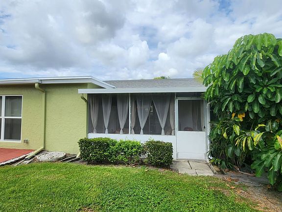 PINES OF DELRAY. Exceptional villa renovation! Contemporary wall colors; textured ceilings; crown molding; 19.6 foot long high-end open kitchen with wood cabinetry, Blum soft-close hinges, 28 feet of granite counter tops; 6''x 3'' granite tile backsplash, 27''x 16''x 9''(deep) stainless steel sink and all stainless steel appliances; recessed lighting; IMPACT GLASS windows throughout; 19.6'' x 19.6'' Keros Ceramica tile in entry hall-kitchen-living rm; sliding glass door access onto tiled & screened patio with east-exposed open greenbelt view; modern bathrooms including granite-walled full-shower in master bathroom; 2024 full size side by side washer & dryer; 2018-installed Rheem 2.5 ton 16 seer AC system. 55+ community, 2 clubhouses w/heated pools, pickleball/tennis/bocce courts. EQUIPMENT AND APPLIANCE REVIEW: