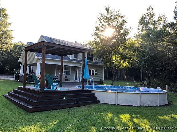 Charming custom built cottage with almost 10 acres of beautifully maintained land perfectly situated close to Fayetteville, I-95 and Fort Bragg. Very private setting with mechanical gate at entrance of long private drive that opens to this beautiful home tucked into the woods and beautifully landscaped. The Main residence features 3 Br/2.5 baths with all custom finishes and design, large deck, pergola and swimming pool. Adjacent to the home is a detached fully insulated three car garage, with a loft above that includes a full bathroom, kitchenette and living/bedroom combo. The home and loft are meticulously designed with no detail overlooked. Fine finishes like Carrara Marble in kitchen, pot filler over range, McKenzie Childs designer wall finishings and many other charming details. Whole house 22kw generator, and wired shed are outside features that are included. Showings to begin weekend of October 11th.