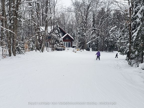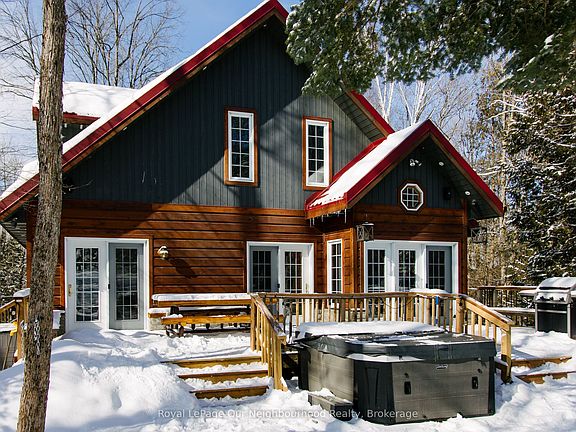 Welcome to 1040 Ski Ridge Trail! This stunning Ski-In/Ski-Out chalet is located directly on Sir Sam's Ski & Bike. Surrounded by pristine forest, offering peace, tranquillity and privacy. Enjoy the ease and convenience of ski-in/ski-out, snow shoeing, hiking or biking as you walk out from the beautiful deck which over looks an 8-person hot tub, 20' sauna and picturesque fire pit as you watch the skiers go by or join in on the fun yourself! The main floor of this tranquil 3+1 bedroom chalet-style home has an open concept main floor with loads of natural light and stunning views of the ski hill from the eat-in kitchen and spacious living room. The large primary bedroom has a small nursery/home office area built in and located directly across from the main floor 4-piece bathroom. The upper level consists of two additional bedrooms and a second 4-piece bathroom. The lower level offers additional living space including a cozy recreation room, spacious games room as well as a den! This property is complete with multi-camera security system, central vac and an EV fast charging station. In addition to the endless winter activities, when the snow melts, take advantage of the bike-in/bike-out access to the incredible bike trails, take a short walk to Eagle Lake public beach and boat launch for fishing, swimming and boating. Endless adventures await near by; hiking, ATVing, snowmobiling, Haliburton Forest, dog sledding, Wolf Centre and much more!