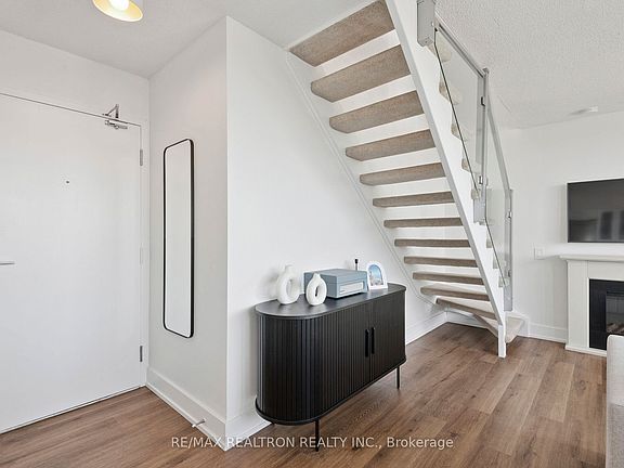 Corner-unit penthouse in the heart of Etobicoke! This modern two-storey, 1 bedroom + den suite offers 843 sq ft. of stylish living, in addition to 400+ sq ft. of outdoor space across both levels. With soaring ceilings and expansive windows dressed with custom roller blinds, the home is flooded with natural light while offering comfort and privacy. The open-concept main floor includes a sleek kitchen with stainless steel appliances and walkout to a wrap-around terrace. Perfect for entertaining or enjoying your morning coffee with unobstructed skyline views. Upstairs, the spacious primary bedroom easily fits a king-sized bed with room for a seating area or lounge space, plus a private balcony for a quiet retreat. The versatile den is ideal for a home office, guest space, or creative studio. Enjoy access to top-tier amenities including 24-hr concierge, gym, indoor lap pool, sauna, and party room. One underground parking spot included. Conveniently located steps to Cineplex, Costco, restaurants, shops, and public transit, with easy access to the Gardiner and Hwy 427 for a quick downtown commute. Custom roller blinds (2023), upgraded finishes, new flooring & cabinetry (2022).
