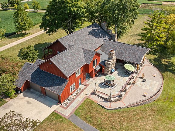 Welcome home! Discover paradise at this 50 acre stunning estate, where a picturesque drive leads you to a grand 5,500+ square foot residence overlooking a peaceful pond and charming waterfall. 5 Bedrooms, 4 Baths, 2 large stone fireplaces and several vintage barns make this property a dream come true. The beautiful 1700 sq ft back patio with natural wood pillars invite you to enjoy the most scenic views. The elite level kitchen with marble countertops are imported from Brazil with custom cabinetry. Updates include a New Roof (2023), New Water Heater (2023), New Geo Thermal System (2023), Whole Home Water Treatment System (2023), all new light fixtures, and paint throughout the home. The living space in the home features high cathedral ceilings with natural wood beam accents. The basement includes a large home theater area and great entertainment space. The property offers everything from mature woods, a river running through it, to 20 tillable acres. The additional outbuildings include a horse barn with 3 stalls, large storage barn, as well as other small buildings. The location is ideal for privacy with proximity to Albany, Muncie or even an easy drive to Indianapolis and Fort Wayne. Come check out your own personal oasis of serenity to make this home your own!