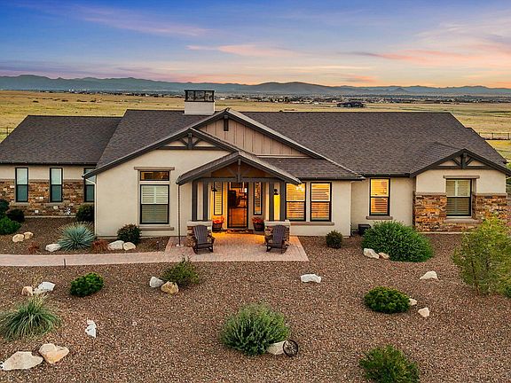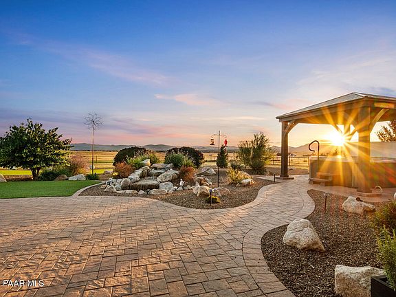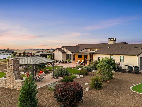 Outdoor living takes center stage in this exceptional custom Gardner home, where every detail has been designed to maximize Arizona's beauty and lifestyle. Step outside to multiple pergolas, winding paver walkways, and vibrant luxurious landscaping accented by multiple areas of artificial turf for low-maintenance elegance. Gather around the impressive stone fireplace, soak in the hot tub, or relax to the sound of a soothing water feature-all framed by sweeping Granite and Bradshaw Mountain views. The seamless flow from indoor to outdoors makes entertaining effortless, with soaring ceilings, and a premier sliding door opening to patio and gathering spaces. Inside, the gourmet kitchen anchors the home with both function and style, featuring granite countertops, a custom brick backsplash and ample cabinetry. With three spacious bedrooms and a versatile den/office, this home offers flexibility for work, guests or hobbies.For adventurers and hobbyists alike, the extraordinary RV garage spans over 1700 sq ft, stretching more then 50 feet deep with a 14 foot door and an additional 10 foot door-ideal for even the largest of RV's, boats or a workshop. Thoughtfully designed with its own bathroom, and fire suppression system, this garage redefines flexibility and storage. Luxurious privacy screen doors throughout the home enhance airflow while maintaining comfort. An attached oversized three-car garage provides even more space. The fully fenced yard with an extra wide electric gate ensures privacy and ease as a full-time residence or a lock-and leave retreat. WELCOME HOME!
