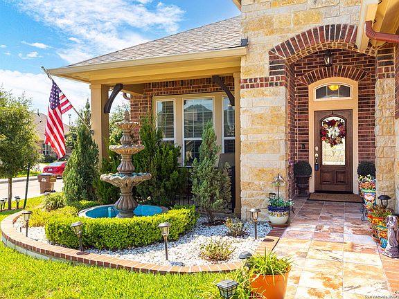 This stunning one-story home is located on a premium corner lot in the desirable Triana subdivision. With its charming water fountain and three-car garage, this home boasts curb appeal. The front sitting porch invites you to relax and enjoy the neighborhood. Inside, you'll find an open floor plan that is perfect for modern living. The home features, three bedrooms, + study (could be used as a Bedroom), + flex/bonus room currently being used as a formal living room but could easily serve as a formal dining room. The gourmet kitchen is a chef's dream, complete with a large island, granite countertops, SS Appliances. Adjacent to the kitchen is a spacious dining room, ideal for entertaining guests. The large family room offers a picturesque view of the backyard. The primary bedroom is a retreat with a bay window and a luxurious walk-in shower. The home features 20-inch tile throughout and carpet in the bedrooms. Plantation shutters add elegance to every room. Step outside into the great backyard, complete with an extended covered patio and a flat-screen TV that conveys with the property. The patio is beautifully tiled and features upgraded railing. Additionally, there is an extra side patio with flagstone, perfect for outdoor gatherings. Two additional storage sheds provide ample space for all your storage needs. This home truly offers the perfect combination of luxury and functionality.