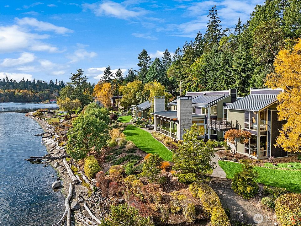 Architectural masterpiece at water's edge with south-facing exposure in tranquil Blakely Harbor. Designed by award-winning Miller Hull, featuring energy-efficient living with PV solar, solar hot water, radiant in-floor heat, and generator. Sustainably crafted with reclaimed wood, madrone paneling, fir, and concrete. Kitchen features Wolf, SubZero, Miele, German greenstone and stainless countertops. Walls of glass open to a stone patio with fireplace. Custom built-ins, gallery lighting, eco-luxury baths, and serene primary suite. Set on a shy acre with year-round sun, 400+ ft of waterfront, curated native landscaping, fire pit, and detached studio/guest space. Easy access to Blakely Harbor Park, Fort Ward, and miles of south end trails.