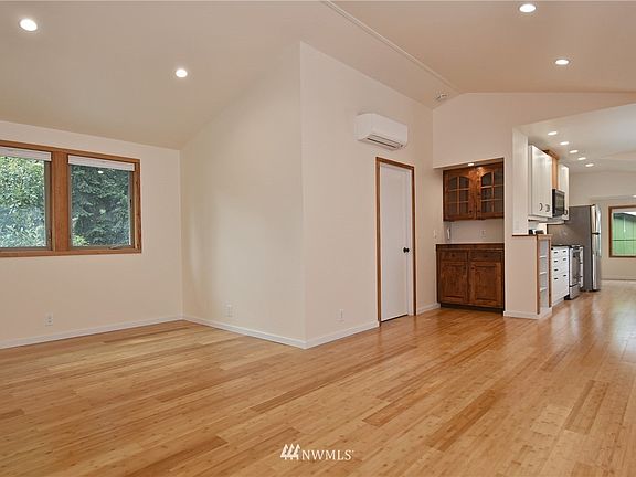 If living in a large apartment complex isn't for you......Bright, clean and airy two bedroom home with high ceilings and great lighting. Bedrooms are carpeted and bamboo flooring in remainder. Larger bedroom fits king size bed comfortably with a full dresser. Bathroom has washer/dryer and heated tile floors. There is a mini split for heating and cooling in the main room and the bedrooms have additional wall heaters. Home comes with black out custom blinds in both bedrooms. If you like gardening there is access to several vegetable beds and large beautiful trees in the yard.