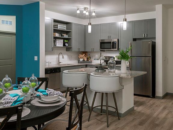 - Exterior features: 42" Custom Shaker Cabinetry, Car Care Center, Community Firepit, Flooring: Wood, Garages Available, Media Room, Pet Park, Pet Washing Station, Poolside Cabanas, Prep Islands or Breakfast Bar*, Refined Contemporary Lighting, Relaxing Soaking Tub*, Screened Verandas*, Single Stainless Steel Undermount Sink, Sleek Granite Countertops, Split Rent Payments with Flex, Stainless Steel Appliances by General Electric, Stylish Tile Backsplash, TV Lounge, Tanning Studio, Wall-to-Wall Lush Carpeting in all Bedrooms, Wellness Yoga Spin Studio