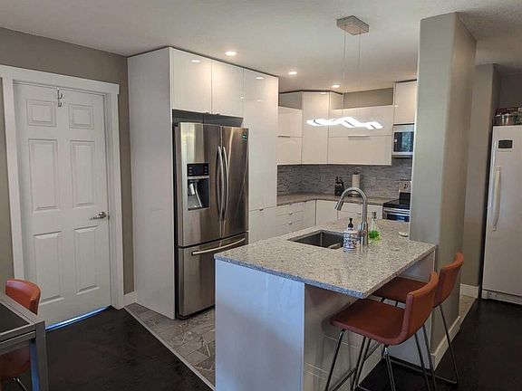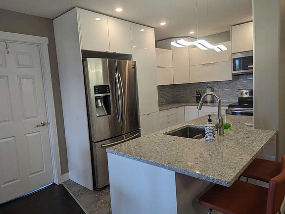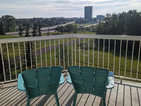 Rare opportunity to own a top-floor corner condo with two single garages and stunning views of Muskoseepi Park and 214 Place from your private balcony. This spacious and beautifully updated 3-bedroom, 2-bathroom unit is one of very few 3-bedroom condos available in the city. With windows on multiple sides, it offers exceptional natural light, cross-breezes, and privacy. The open-concept layout has been updated throughout. The modern kitchen includes stainless steel appliances, quartz countertops, tile flooring, an undermount sink, and a bonus butler’s pantry. Both bathrooms have been updated, with a 4-piece main bath and a 3-piece ensuite. The generous primary bedroom includes a walk-in closet and ensuite. The second bedroom is set up as a bedroom and fits a queen bed and has two large closets. The third bedroom is currently set up as an office with built-in shelving but could be easily used as a 3rd bedroom. Additional features include in-suite laundry, a private balcony overlooking Muskoseepi Park, and a well-equipped fitness room on the main floor. This rare condo also includes two private single garages, an exceptional bonus rarely found in condo living. The condo fee of $699.96 per month includes heat, water, building maintenance, condo management, offsite security monitoring, and reserve fund contributions. The building is well-managed with a healthy reserve fund and proactive condo board. Currently rented furnished, making it an attractive investment opportunity or an easy transition for an owner-occupant. Furnishings can be negotiated with a new buyer if desired. Centrally located for quick access to downtown, shopping, and walking trails.