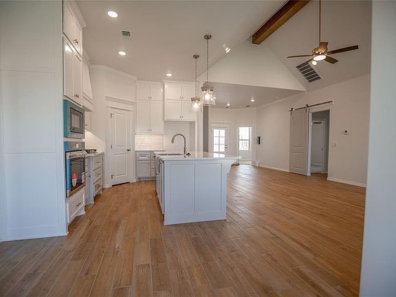 FENCING AND BLINDS INCLUDED! This Sage Bonus Room 1 floor plan includes 2,550 Sqft of total living space, which includes 2,300 Sqft of indoor living space & 250 Sqft of outdoor living space. There's also a 625 Sq Ft, three car garage with a storm shelter installed. This home offers 4 bedrooms, 3 full bathrooms, 2 covered patios, & a bonus room! The living room features an outstanding cathedral ceiling, a beautiful fireplace with our stacked stone surround detail, large windows, & wood-look tile. The kitchen has decorative tile backsplash, stainless steel built-in appliances, well-crafted cabinets to the ceiling, 3 CM countertops, a corner pantry, & a large center island with a trash can pullout installed. The primary suite boasts an extraordinary, sloped ceiling detail with a ceiling fan, sizeable windows, and our cozy carpet finish. The attached spa-like primary bath features a dual sink vanity, a European walk-in shower, a Jetta Whirlpool tub, a private water closet, and an incredible walk-in closet that will leave you absolutely speechless. The covered back patio offers a wood-burning fireplace, a TV hookup, & a gas line. This home also features healthy home technology, a fresh air ventilation system, a tankless water heater, & so much more!