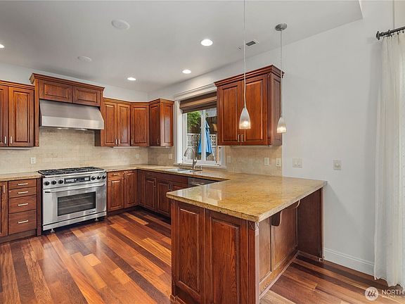 This centrally located condominium in the Clyde Hill area of Bellevue is a solid 2+ level townhouse just off Bellevue Way. It's within a few blocks of Bellevue Square and the many conveniences and marvelous restaurants of the city. Level streets are great for walking pets or other precious cargo or meeting neighbors. Enter this beautiful townhome to cherry hardwood floors throughout the main level, wonderfully crafted wainscoting, sky lights, vaulted ceilings and well-lit spaces. Stainless steel appliances, including gas grill, SubZero refrigerator and granite countertops support the chef in you. Central vac makes clean up easy. Gas heat and water heater make warming up on damp Puget Sound nights fast and affordable.