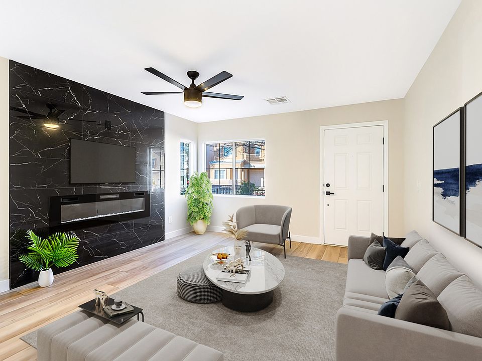 Welcome to this beautifully remodeled 2-bedroom, 2.5-bath home in a desirable gated community. This home features a bright, open floor plan with modern finishes throughout. The spacious living room is flooded with natural light, while the updated kitchen boasts brand-new stainless steel appliances, quartz countertops, and custom cabinetry. The luxurious primary suite includes an en-suite bath with a walk-in shower and dual vanities. A second bedroom and updated full bath offer comfort and privacy. A convenient powder room on the main level adds ease for guests. Step outside to your private patio, perfect for entertaining or relaxing. Enjoy the community's BBQ area and walking paths, perfect for outdoor enjoyment. Ideally located near shopping, dining, and major highways, this home provides both style and convenience. Don't miss the opportunity to make this move-in ready gem yours!