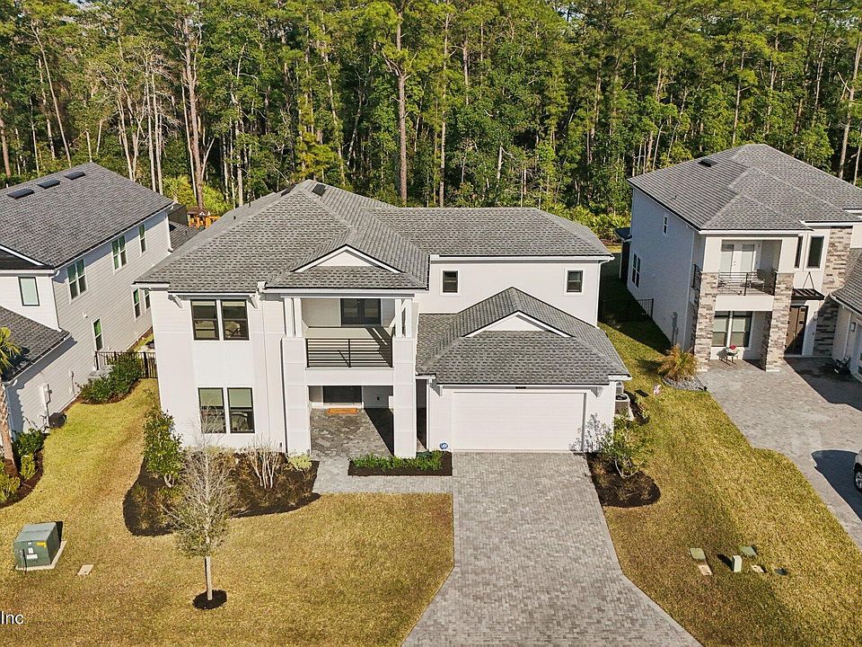 Welcome home to this beautiful, like new home in Edison: ETown's premier, gated community. Walking up, you will notice the over sized, covered front porch and beautiful entry door. As you enter the home, it opens to a large foyer with a half bathroom, laundry room and 3-car tandem garage on one side. On the other side is a bedroom/bathroom and spacious office. Engineered wood flooring throughout the home downstairs aids in creating great flow. The home then opens to the living area, dining area and gourmet kitchen. The kitchen boasts a massive pantry and large quartz island. The owner's suite is off the living area with a luxurious, huge walk in shower and garden tub in the primary bathroom. Upstairs is carpeted with 2 more bedrooms and bathrooms along with a massive bonus room/5th bedroom. There is a balcony as well. As you head outside, there's a huge sliding glass door that leads to a covered, paver patio. The patio is equipped for a summer kitchen and TV to enjoy as you overlook your large backyard with a wooded view! The community is gated and part of a large master planned community. There is ever expanding retail in the community. There are resort style amenities. This community is also centrally located. Everything is 15 -20 minutes away including the beach, the St. Johns Town Center, downtown and more!