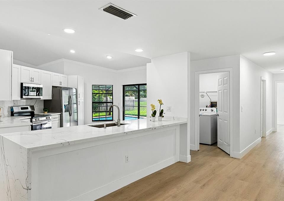 Welcome to this beautifully renovated single-story pool home located in the highly desirable Shenandoah community in Davie. 4-bedroom, 2-bath single-story POOL home in Shenandoah, Davie. Features include luxury vinyl flooring, a brand-new kitchen with white wood cabinets, quartz countertops, new stainless steel appliances and solar panels for energy efficiency. The master bath has been fully updated with a freestanding tub and modern finishes. Freshly painted with new lighting throughout and includes a new washer and dryer. Enjoy the screened patio, private pool, and a 2-car garage. Roof replaced in 2018. New water heater Move-in ready and perfectly located near top schools, parks, and major highways.