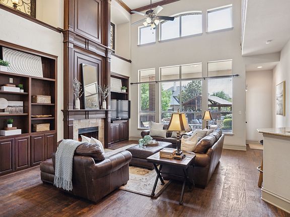 The heart of the home is the gourmet kitchen, a chef’s dream featuring a built-in refrigerator, double ovens, Thermador professional cooktop, appliance keeper, and a large center island—perfect for entertaining or casual gatherings. The kitchen flows effortlessly into the living room, where soaring ceilings, a dramatic double-stacked fireplace, built-in bookcases, and rich wood floors set the tone for upscale living. Tucked behind the living space is a full wet bar with wine storage and plenty of space for your bartender.The formal dining room connects directly to the kitchen for seamless entertaining, while the formal living room—connected to a private study—is the perfect setting for a grand piano or quiet retreat.The luxurious first-floor primary suite offers a private escape, complete with an expansive ensuite bathroom featuring premium finishes and spa-like amenities. Upstairs, you’ll find additional bedrooms, a spacious game room with wood panel ceiling and pool table, and a dedicated media room for immersive movie nights or game-day viewing with access to a bar with serving counter, microwave, and beverage cooler.