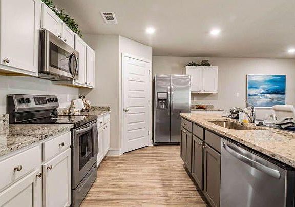 Meet the charming Cali plan nestled in the heart of Long Beach, the number one school system in the state. the Cali plan, a spacious 4 bedroom, 2 bath home design with four-sided brick, gas, and vinyl exterior as well as a 2-car garage. Includes upgraded luxury vinyl flooring, granite counters, soft close cabinets in kitchen and bathrooms, as well gas tankless water heater, a large kitchen island. The primary bedroom is at the back of the home for privacy. Recessed LED light package and home is smart home. The home is built with engineered plans and built with expansion joints on each side for a preferred insurance rating. The roof and sides are covered in Zip sheathing which is used in areas with high winds and wind driven rain. The primary bedroom features a soaker tub and a separate shower as well as dual vanities and a large walk-in closet. Pictures are of a previously built home with the same or a similar floor plan