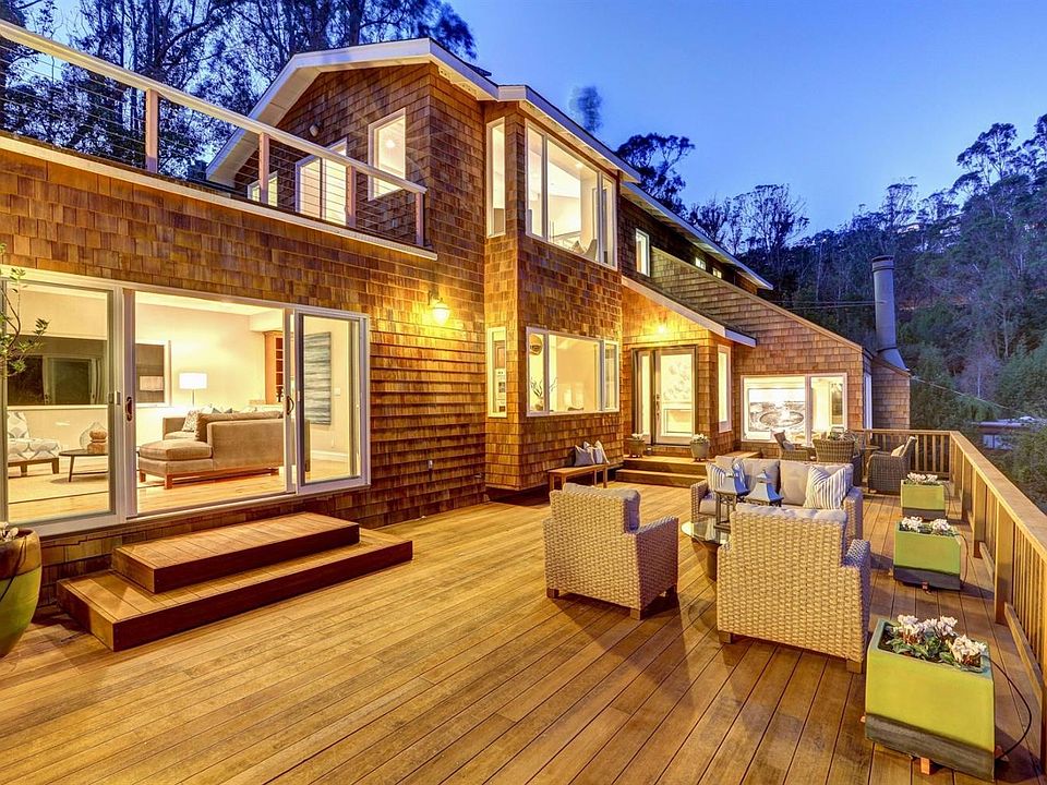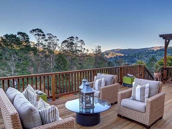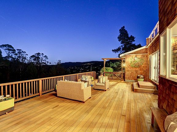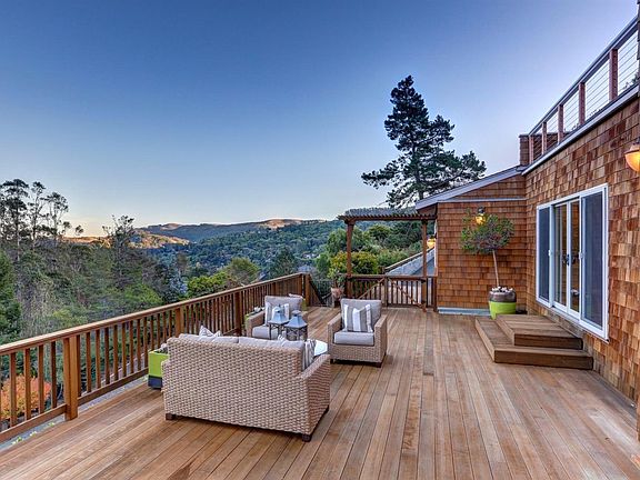 Peaceful & private, with award winning schools & easy access to trails, this home is an ideal place to raise a family in beautiful Mill Valley. 4 bd/4.5ba. 3 decks & 2 flat lawns, a gourmet kitchen with large center island & top of the line finishes & appliances, 2 fireplaces & an open living room & sep. dining room w/ wet bar for entertaining. Thoughtfully remodeled in 2007 with the addition of solar panels & numerous energy efficient upgrades
