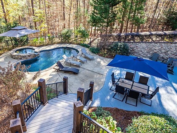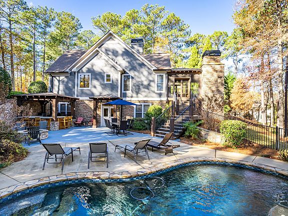 Custom built home in The Landing at Reynolds Lake Oconee. Recently renovated and move in ready. The home sits on a double lot overlooking #8 fairway and has it's own private backyard oasis featuring a hot tub with a waterfall flowing into a heated pool. The fenced pool area also has a fire pit and a new outdoor kitchen. New composite flooring and aluminum rails on all decks and a wonderful new screened porch with outdoor fireplace overlooking the golf course and pool. The kitchen is a chef's dream with quartz countertops, commercial SS appliances, custom cabinets and a massive prep island. Separate dining room, breakfast area and a breakfast bar. Custom walk in pantry. Exposed beams and a giant stacked stone fireplace highlight the great room. Master on main with french doors leading to the screened porch. The master features trey ceilings, tile shower, soaking tub and a custom closet system with a back entrance into the laundry. Powder room. Garage apartment with a full bath. Terrace level with engineered hardwoods, family room, media room/5th bedroom, two bedrooms (one featuring an ensuite bath), plus an additional full bath. Seller is making a Reynolds Club Membership available.