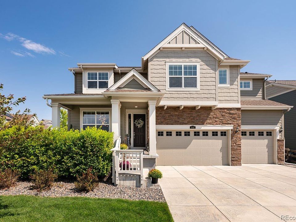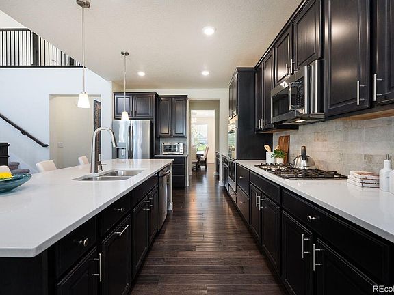 An elegant entryway opens into a spectacular two-story great room, bathed in natural light and anchored by a grand chandelier and quartz-surround fireplace. The formal dining room is perfectly scaled for entertaining, complete with custom lighting, engineered hardwood floors, and space for an eight-person table. A nearby butler’s pantry offers espresso cabinetry with glass-front details, quartz countertops, and smart storage solutions. The gourmet kitchen delights with a five-burner gas range, double ovens, crown-molded cabinetry, and a French door refrigerator. From the sunlit breakfast nook, step out to a spacious covered deck with mountain views, landscaped grounds, and a custom circular fire pit, where you can enjoy Rocky Mountain views. This seamless indoor-outdoor connection enhances daily living and creates an ideal setting for entertaining. The main floor also features a full bath and guest suite, while the upper level hosts a serene primary retreat with tray ceiling, custom lighting, spa-inspired bath, and walk-in closet with direct laundry access. Three additional bedrooms—each with en suite or Jack-and-Jill access—provide ample comfort and versatility. Additional highlights include an oversized three-bay garage, dual HVAC, wrought iron railings, and a full unfinished basement with nine-foot ceilings and a radon system. With its thoughtful design and stunning views, this Homestead Drive address offers the perfect balance of elegance and everyday ease. This Property has a 2.25% assumable VA loan (applies only to those utilizing a VA loan).