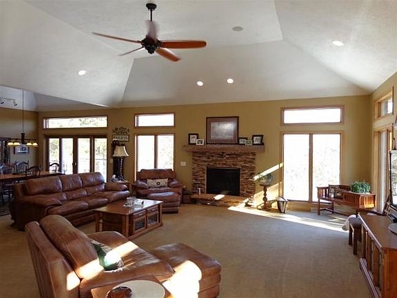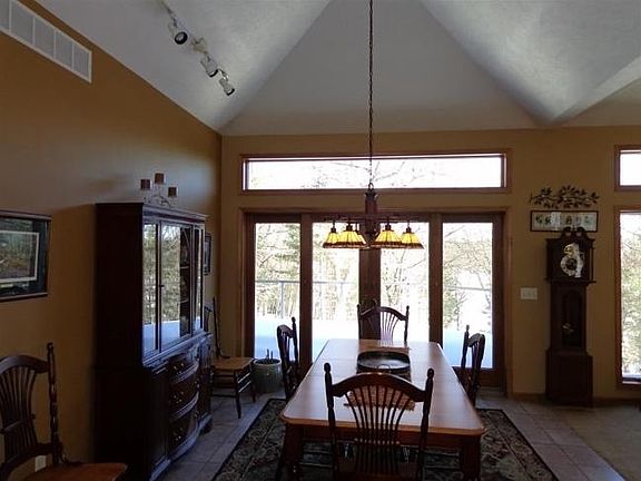 RINEHART LAKE PROPERTY! Custom built waterfront home with open concept floor plan, volume ceilings, 2 fireplaces, granite counter tops, surround sound, walk out lower level, access from garage to basement, appliances, central vac, dock and extra 2 stall garage. Very private, exceptionally well built home. Fantastic value and only 12 minutes east of Stevens Point.