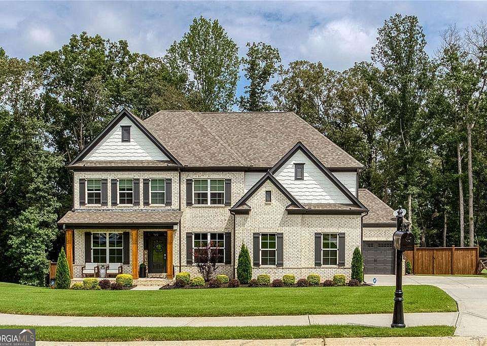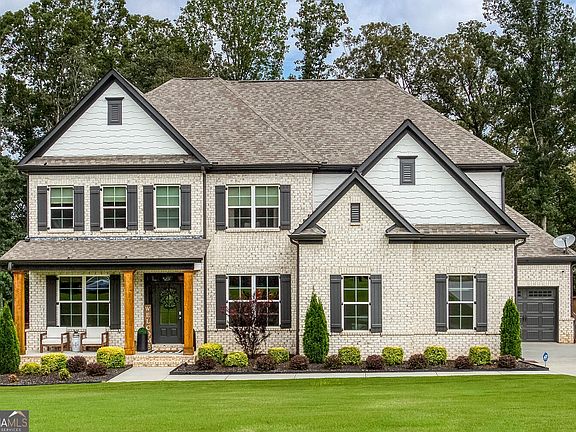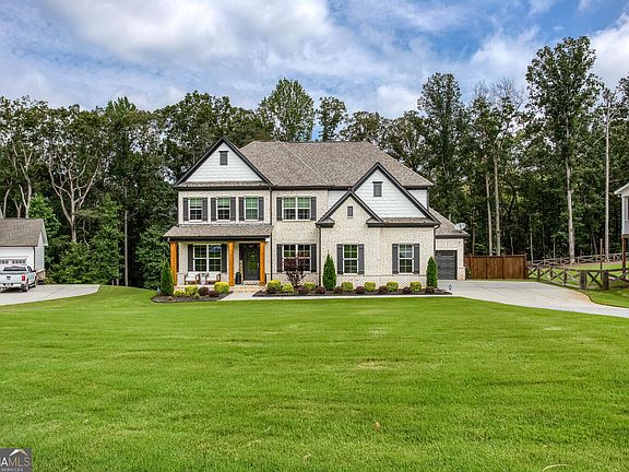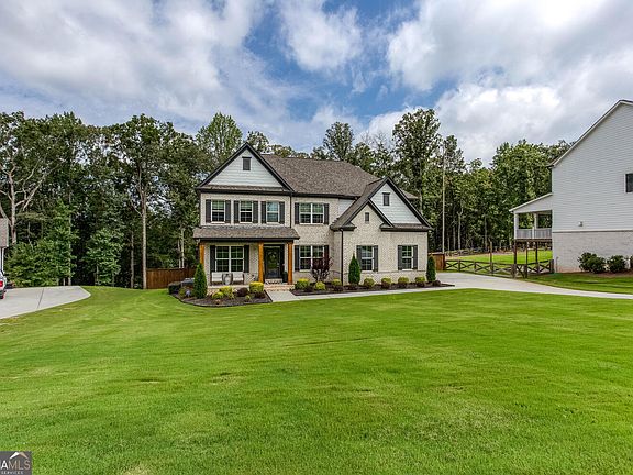 Welcome to this stunning 6,449 square foot brick-front cul-de-sac home with 3-car garage in Hoschton, GA featuring dramatic 6x9 windows, trey and coffered ceilings, and extensive upgrades throughout. The main level offers a chef's kitchen with granite island, custom pantry, wood beams in the keeping room, and cedar columns accenting the front porch, a guest bedroom with a full bath, a powder room, an office with french doors, a separate dining room with butler pantry, while the upper level boasts a spa-like master suite with walk in shower, walk in custom closet and extra sitting area in the master suite, also upstairs is a raised level video/theater/party room, a jack and jill suite with 2 bedrooms and an additional bedroom with its own bath and a large laundry with cabinets and sink in the hallway. The newly finished basement (2025) includes a custom home theater with a Murphy-Style hidden door and theater-styled leather seating, a full kitchen with flat-top, microwave/convection oven (air fryer) and refrigerator, dish washer, chiller, a bar area, a gym room, wine room, game room, and luxury steam shower, 2 rooms near the full bath could be bedrooms. A private fenced yard with a covered and screened rear porch, hardwood flooring throughout, custom cabinetry, and a professionally installed Tesla charger in the garage complete this one-of-a-kind home.