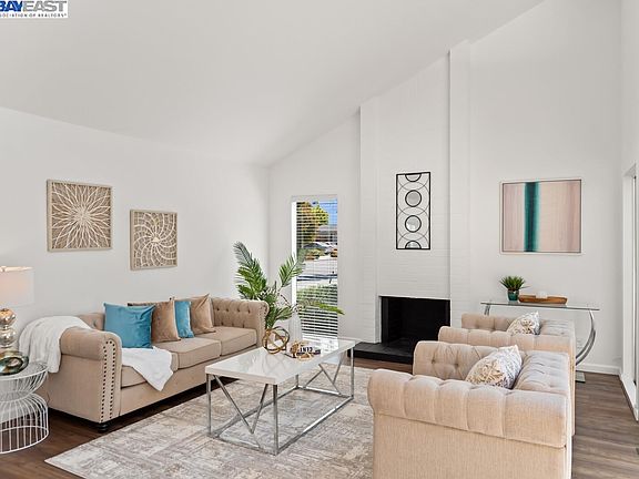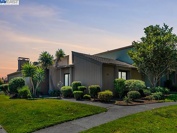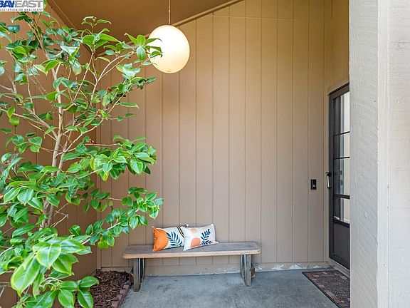 Single Level. Sun drenched town home with bonus space for an office, exercise, or playroom. This end unit is in a park-like setting adjacent to greenbelt, tennis, and basketball courts. Most amenities needed for basic living are just a short stroll away: Starbucks, groceries, restaurants, dry cleaner, auto repair, pet grooming, beauty shop, shipping service shop, and more. Vaulted ceilings, high windows, and attractive plank flooring create a modern space for lounging. Seamless flow from open living/dining room to the breezy private patio for effortless indoor/outdoor entertaining. Fruit trees in the patio bear figs and oranges. Beautiful maple tree is on display with other flowering plants. Upgraded eat-in kitchen with granite counter tops and slider to patio for easy food serving or cooking outdoors. Bathrooms have been refreshed with new white shaker vanities accented with brushed brass fixtures, Carrara quartz countertops, stylish light fixtures and new mirrors. Ensuite bedroom is spacious with vaulted ceilings, plenty of natural light, and spacious walk-in closet. This wonderful home is located near award-winning schools, community pool, public transportation, easy access to freeways, golf courses, ferry terminal, library, and more. Window blinds are available.