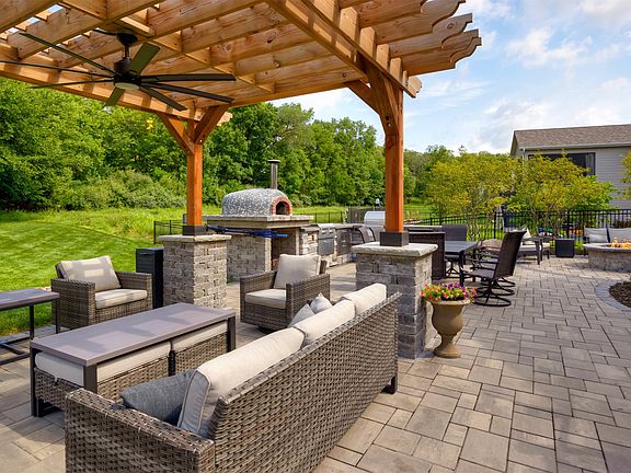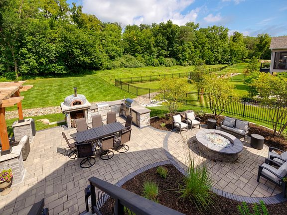 Beautiful stone fireplaceGas fire pitBeverage centerRec roomOpen concept livingVaulted ceilingsWalk-in pantry