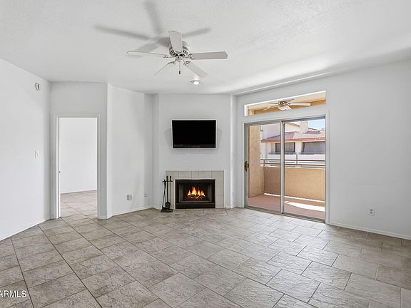 This freshly painted, second-floor unit features a split floor plan with two bedrooms. The primary bedroom includes an en-suite bath and a walk-in closet. The covered balcony, accessible from both the primary bedroom and the living room, offers two ceiling fans. The kitchen provides ample cabinetry, including a five-foot pantry. The entire home features tile flooring and an open floor plan with a cozy fireplace. The owner also replaced the AC unit within the last five years.