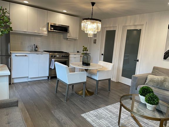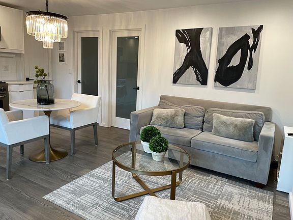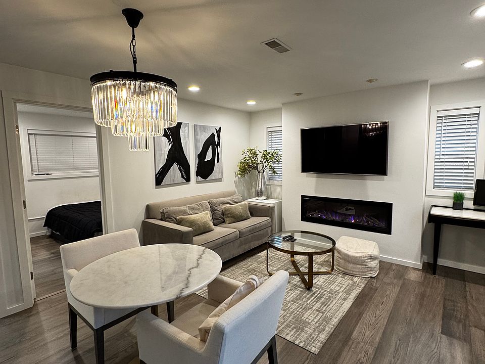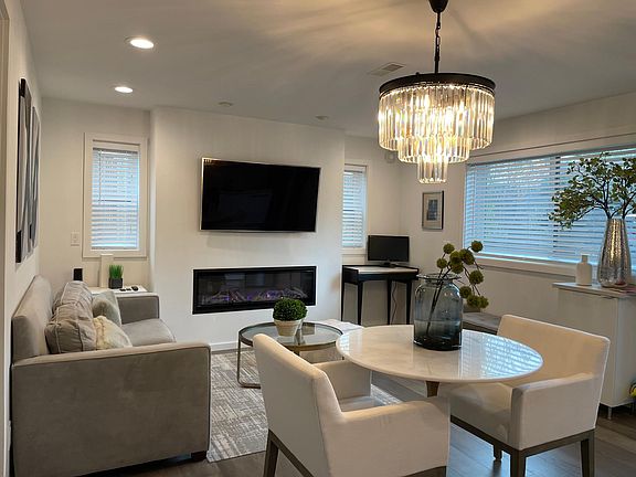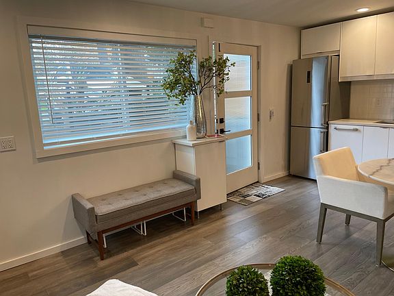 Fully-furnished in-law suite with high-end finishes and premium appliances. Rent includes all utilities, including internet. Gray oak hardwood floors, carrara marble tiles in bathroom, three shower heads, Kohler powered Bidet toilet seat, quartz countertops, Bertazzoni Kitchen appliances, Miele washer and dryer, Restoration Hardware bathroom vanity, Kohler Purist faucets throughout, large flatscreen tv in living room and bedroom. Electric fireplace with heat in living room. Off-street park and private patio with planter available for gardening.