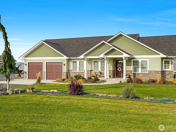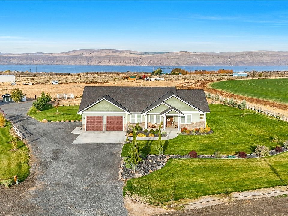 On a manicured 3.2 acres, this high-end home with 3 bedrooms plus an office exudes exceptional craftsmanship and luxury. The open concept great room impresses with vaulted ceilings, a cozy propane fireplace, solid hardwood floors, and a wall of windows showcasing breathtaking views of Banks Lake and its dramatic basalt cliffs. The spacious primary suite offers double sinks, a beautifully tiled shower, and a big walk-in closet. The gourmet kitchen is a chef’s delight, featuring a gas stove, custom cabinetry and granite countertops. Step outside to the Trex deck to soak in the scenery, or to enjoy the insulated, fully finished, RV-sized 1700+ sq ft shop with 864 sq ft guest quarters - perfect for visitors, storage and extra workspace.