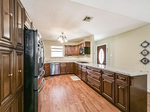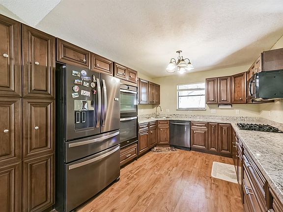 Updated single-story home ideally situated near schools, shopping, and entertainment. Step inside to discover a beautifully remodeled interior featuring an inviting open layout with high ceilings, designer beams, and abundant natural light. The chef’s eat-in island kitchen is a showstopper, offering custom cabinetry, extensive granite countertops, and stainless steel appliances—perfect for cooking and entertaining. The spacious living area seamlessly connects to the kitchen, creating a warm, open-concept flow. Enjoy a desirable split floor plan, providing privacy for the primary suite, which includes a luxurious en-suite bath. Secondary bedrooms are generously sized and versatile for guests, work, or play. Outside, the nice size backyard offers plenty of room for gatherings, gardening, or relaxation under the stars. Move-in ready with thoughtful updates throughout—this home combines style, comfort, and convenience in one perfect package!