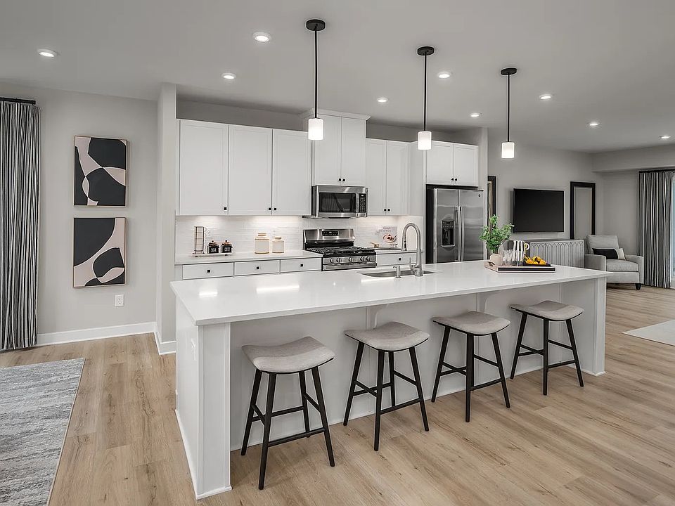 Step inside to an open-concept main level featuring a gourmet kitchen with white cabinetry, stainless steel appliances, wall oven, cooktop, tile backsplash, and a large island perfect for meal prep or entertaining. The living and dining areas flow effortlessly together, filled with natural light and hard surface flooring throughout.