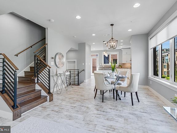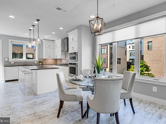 End Unit. Built in 2019 by EYA Homes, 4 bedrooms and 3.5 baths. This stunning four-level end-unit townhome in sought-after Montgomery Row offers over 2,100 sq. ft. of stylish living space. The home impresses with beautiful floors, soaring ceilings, expansive windows, and an open, light-filled layout. The main level boasts a chef’s kitchen with quartz countertops, designer backsplash, oversized island with seating, and access to a private balcony. The kitchen flows seamlessly into the spacious dining and living areas, surrounded by walls of windows that bring in abundant natural light and showcase serene community views. Upstairs, the second level includes two generously sized bedrooms and two full baths, including a sophisticated primary suite with a spa-like bath and walk-in closet. The top level features a third bedroom, full bath, large family room, and private rooftop deck—perfect for relaxing or entertaining. Additional highlights include a two-car garage with storage, plus a bonus garage space across the street. Ideally located between the Capital Beltway and I-270, commuting is a breeze. The home is tucked into a quiet neighborhood yet just minutes from Grosvenor Metro, Westfield Mall, Wildwood, and Pike & Rose—offering the perfect balance of tranquility and convenience. // 2 car garage, 1 on-street parking AND 1 pass for the office garage across the street. //
