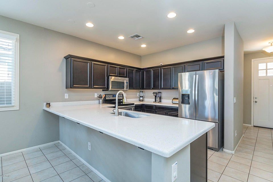The gourmet kitchen is a chefs dream, showcasing quartz countertops, maple cabinetry with crown molding, stainless steel appliances, and a peninsula-style breakfast bar with ample prep space and seating for guests. Sleek ceiling fans add comfort and efficiency throughout the home.