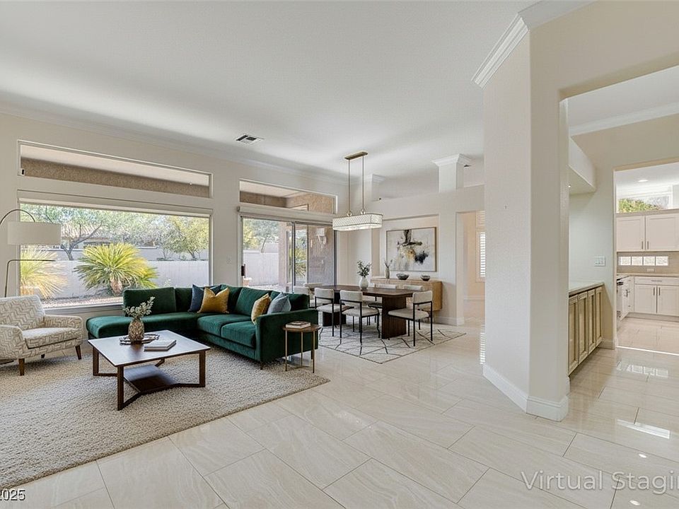 Beautifully Remodeled Hancock Model in Sun City Summerlin! This light-filled home features an open floor plan with shutters throughout and striking high-gloss 16x32” polished porcelain tile. Two bedrooms plus a den, the layout provides comfort and flexibility. The remodeled kitchen has quartz countertops, a backspace, hooded oven, built in wine rack, white cabinets, and stainless-steel appliances. Both bedrooms have luxury vinyl plank flooring. The primary suite includes a bay window, dual sinks, makeup table, separate tub/shower, and a large walk-in closet. Lots of storage cabinets throughout the home. Step outside to a large, covered patio. The 2-car garage includes golf cart parking. Located in the premier 55+ Sun City Summerlin community, you’ll enjoy 3 golf courses, indoor & outdoor pools, fitness centers, pickleball courts, and endless social activities. Just minutes from Downtown Summerlin shopping, dining, and entertainment. This home has an assumable loan at 2.375%!