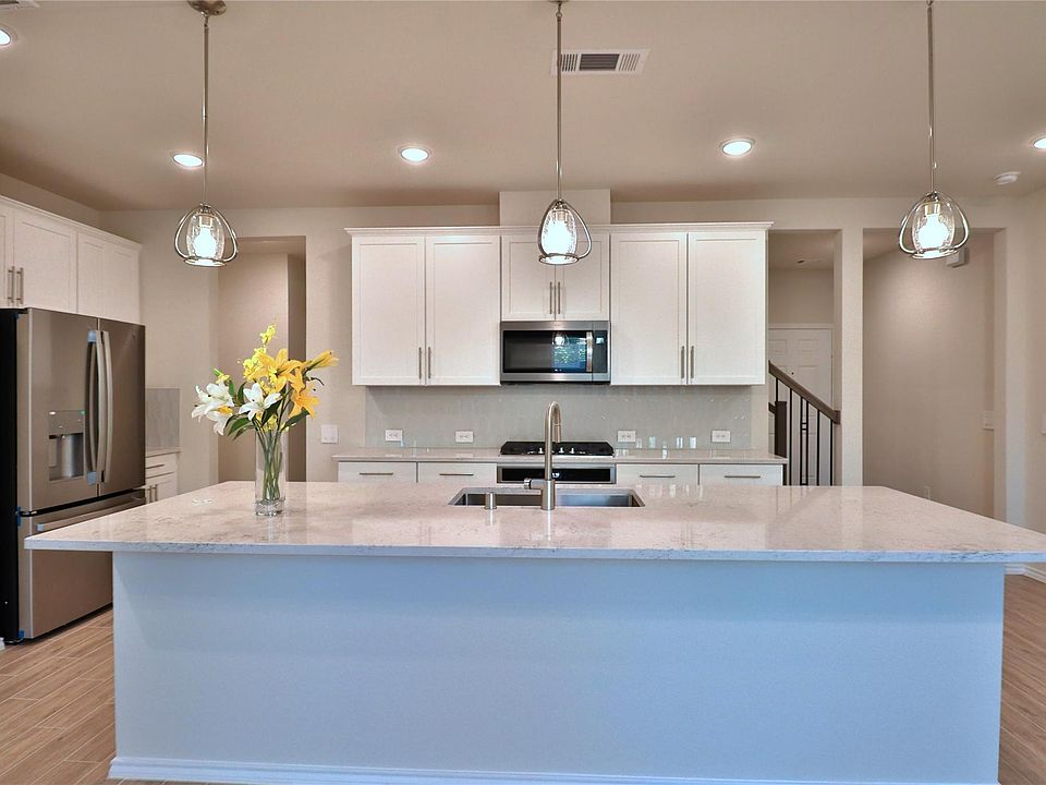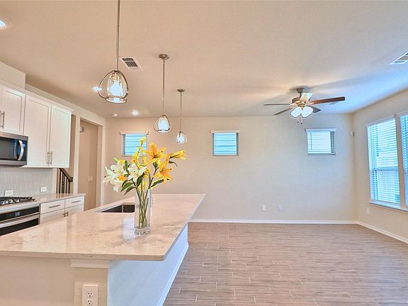 Open floor planNice window blindsElegant quartz countertopHuge islandWalk-in closetsDouble sinksWood like tile