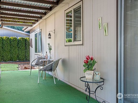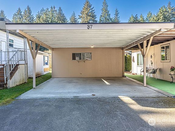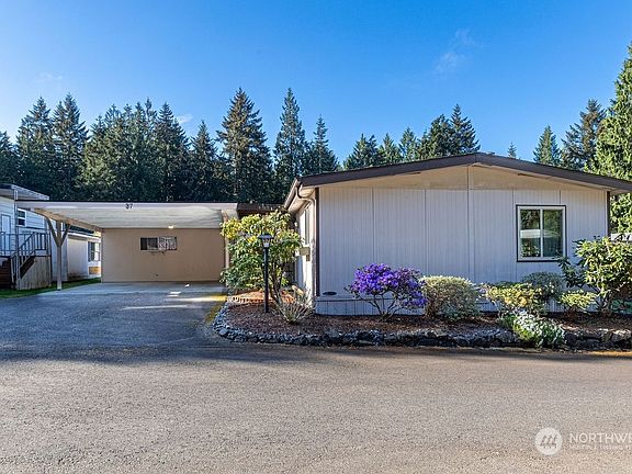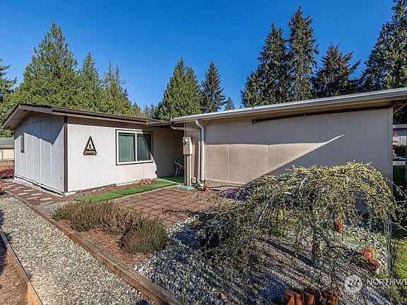 Welcome to Hillcrest, a very desirable area just up the hill from Gig Harbor's Historic Downtown. The immaculate Manufactured Home Park is a 55+ community. This 2 bedroom 1.5 bath home has 1152 sq ft of living space. You will be welcomed by the spacious open floor plan and cozy wood burning fireplace. The large primary bedroom has plenty of closet space and full jack and Jill bath. Shopping is easy with Costco,Target & other stores,restaurants close by. The landry area and half bath are centrally located and lead to a added workshop or it could be a giant walk in pantry. Enjoy AC on hot days, easy maintenance landscaping a covered carport, large Storage shed & ground level entry. Space rent includes water,garbage,septic.