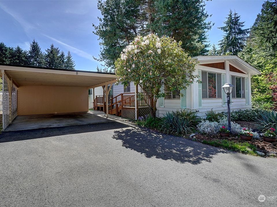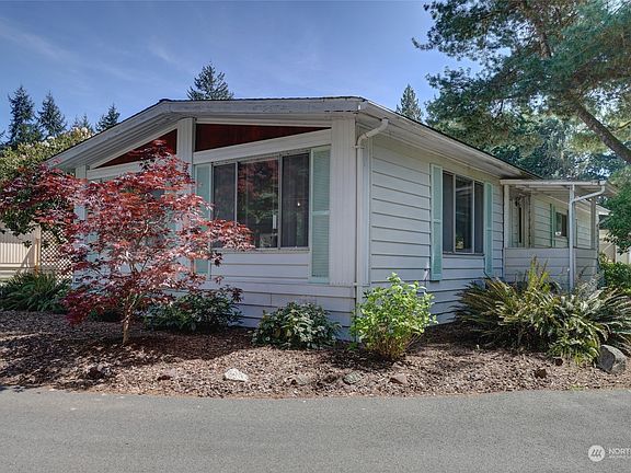 Meticulously maintained & move-in ready home in desirable Hillcrest Mobile Home Park (55 and older). Comfortable floor plan with large living room & built-in hutch, family room off kitchen with convenient breakfast bar, pantry & double sink. Large primary bedroom with 3/4 ensuite bath & dressing area. Another good sized bedroom & 3/4 bathroom. Separate utility room w/washer & dryer plus door to fantastic yard. Desirable forced air heat & A/C! New carpet, vinyl, dishwasher & awning. Roof is in fantastic shape. Attached 2 car carport w/storage shed. Private location just minutes from downtown Gig Harbor waterfront, restaurants, shopping, Costco and more, so convenient! Site rent is $800 per month, includes water, garbage, sewer/septic.