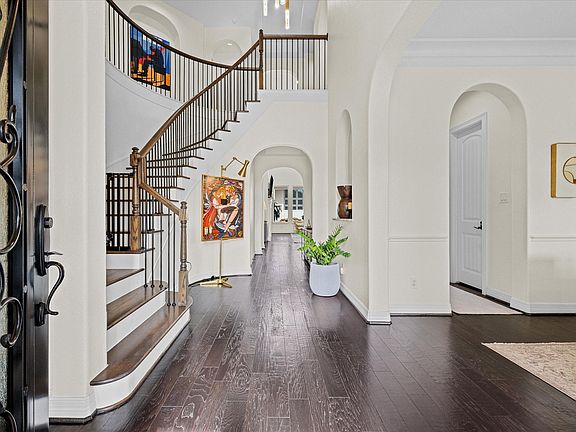 Discover modern luxury at 10414 Roseate Skimmer in the sought-after Grand Central Park community. This elegant two-story home features a stunning Mediterranean-inspired exterior and a bright, open-concept interior with soaring ceilings, rich hardwood floors, and walls of windows that fill the space with natural light. The gourmet kitchen boasts granite countertops, custom cabinetry, and stainless-steel appliances, flowing seamlessly into the spacious living and dining areas—perfect for entertaining. A private home office provides a quiet workspace, while the serene primary suite offers a spa-like bath for ultimate relaxation. Step outside to your own resort-style retreat with a sparkling pool, spa, rock waterfall, and covered patio ideal for outdoor gatherings. Conveniently located near parks, shopping, and dining, this exceptional home blends elegance, comfort, and functionality in one perfect package.