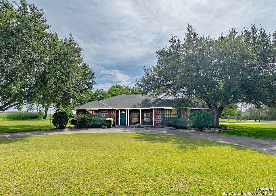 Located West of Pettus , this beautiful home sits on 2 lots, is landscaped , has mature oak trees and a lush yard. A circle drive in front welcomes your guest while the concrete drive to the side garage includes extra parking for an RV. The split floor plan is centered with spacious living room complete with high ceilings and a wood burning fireplace. The dining area provides the room needed for those holiday gatherings and is steps away from the kitchen and breakfast area. An array of windows allows a serene view of the shaded yard while cooking or enjoying an intimate dinner for two. Thoughtful design is reflected in the primary suite with garden tub and shower. The 2 car attached garage is complete with a storage and separate workroom. This home is supplied utilities from the local Municiple Utility District but also has a water well which supplies water for the sprinkler system. A private patio and electrical connection for RV are just a few extras that await you at this immaculate maintained home on .68 of an acre.; Original MLS#: 113471; Deed Restrictions: Yes; Features: Porch-Covered; Home Warranty: No; Land Dimensions: .688; Land Size Apx: .688; Water District: Yes; Water Heater: Electric; Windows: Thermal; Zoning: None