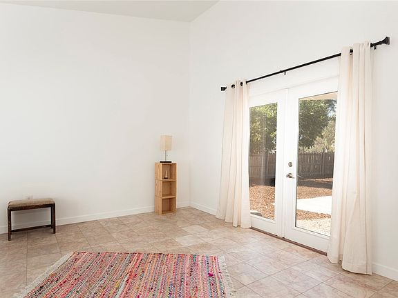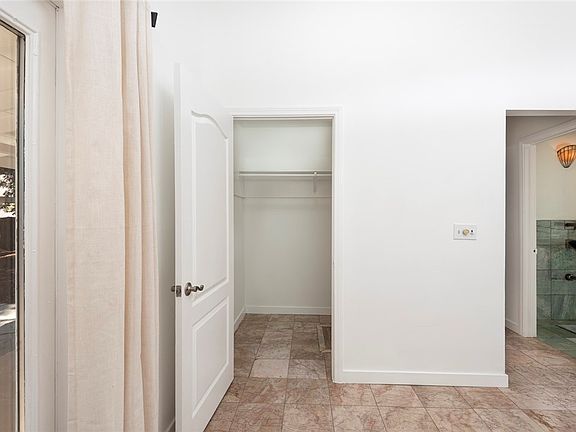 The spacious primary bedroom features soaring ceilings, a large walk-in closet, and French doors that open to a serene garden area—ideal for morning coffee or evening relaxation.