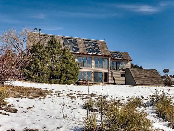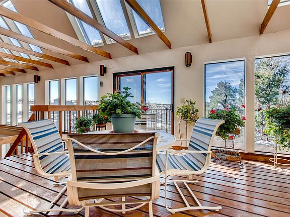 Unique custom built "passive solar" home. You'll delight in the abundance of natural light & beautiful views with all its south facing windows & skylights. This carefully designed well-built home boasts of low utility bills during all seasons. Large open main floor master retreat with a fireplace and sitting area, five piece bath, dressing area, built in vanity, double closets & even an en-suite deck. Spacious formal dining room, library area & enclosed foyer. Three wood burning fireplaces. Large walk-out lower level includes 3 bedrooms, full bath, family room with wet bar as well as ample storage. Beautiful solar sun rooms & decks! Located on 3.6 acres in the desirable Chatfield East community which includes horse trails, a riding arena and open space. Country living with wild life visitors yet close to shopping and amenities. Public water & the use of a well for outside and horses, if desired. This well maintained home was recently updated with a newer septic line & well hydrant.