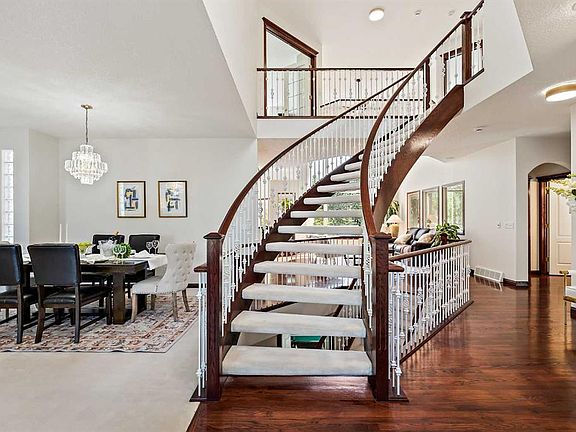 LOCATION, LUXURY, AND COMFORT — THIS DREAM HAS ALL! Located in the best part of The Hamptons, which is Calgary’s most sought-after golf course community, and just a short walk cross the street to Hamptons public school (K to 4), 3 mins drive to the junior high Tom Baines public school and 10 min drive to the famous Churchill high school. This house is also located near the Stoney ring road for an easy commute to the airport and the Rocky mountains. Backing onto a golf course and facing a large green space, this custom-built estate home offers a million-dollar view and unmatched privacy. This beautifully designed 4+1 bedroom plus office, 3.5-bathroom former show home offers over 4,000 sq ft of developed living space. The professionally designed, fully developed walk-out basement is ideal for entertainment, accommodating guests, or as a rental opportunity. Step inside to a grand 18-foot open-to-above foyer featuring a striking spiral staircase filling the home with natural light and a sense of grandeur. The main floor boasts an open-concept layout anchored by a gourmet chef’s kitchen, complete with a Bosch fridge, Bosch dishwasher, and a built-in oven and microwave which are replaced in the recent years. A spacious pantry adds generous storage. The living room features 18 feet soaring ceilings and floor-to-ceiling windows that capture the morning sun and provide tranquil views of the golf course. The space is centered around a stunning 3-sided fireplace. Step out onto the expansive balcony and enjoy views of the golf course and green space—perfect for morning coffee or evening relaxation. The balcony vinyl cover is brand new. Additional main-floor highlights include: A large office/guest room; An oversized laundry/mudroom; Elegant hardwood flooring; Expansive balcony with BBQ gas line. Upstairs, you’ll find 4 spacious bedrooms and 2 full bathrooms designed for family comfort. The master bedroom is a luxurious retreat, complete with a spa-like 5-piece ensuite. It includes dual vanities, a Jetted soaker tub, separate shower, brand-new quartz countertop, and a skylight. The bedroom also offers an unobstructed view of both the golf course and green space, plus a beautiful nature gas fireplace. The second full bathroom also features a new quartz countertop, skylight, and attractive vinyl flooring. The professionally finished walk-out basement provides endless versatility—ideal as a guest suite, mortgage helper, or entertainment space. It has 1 bedroom and 1 full bath, a large recreation area/living room, a wet bar with direct access to a covered patio and landscaped backyard The east-facing yard is perfect for sunny mornings and shaded summer afternoons. Backyard highlights: Expansive green space for family fun like living in forest; Mature apple tree with good production every year; Wooden Canopy surrounded by lush greenery that creates a peaceful, natural retreat; Covered patio. Additional Features: Oversized, heated double garage; Two new high-efficiency furnaces