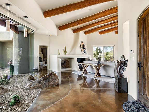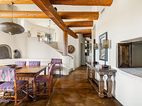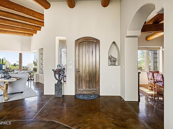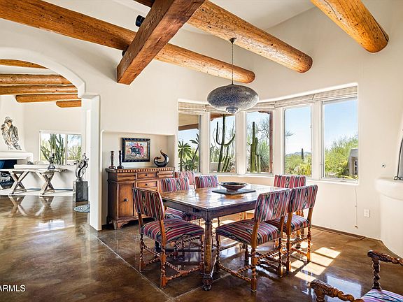 The home is a balance elegance and southwest charm features floor‑to‑ceiling glass, wood, multiple fireplaces, chef's kitchen, two living and dining areas along with two main floor suites with luxurious baths, fireplaces and access to the patio. The upper level suite features a kitchenette, desk work area and private balcony. Backing to natural area open space the outdoor spaces are the ultimate in a relaxing luxury retreat with pool and spa, large covered patio areas, built in bbq and fireplace with tons of privacy.