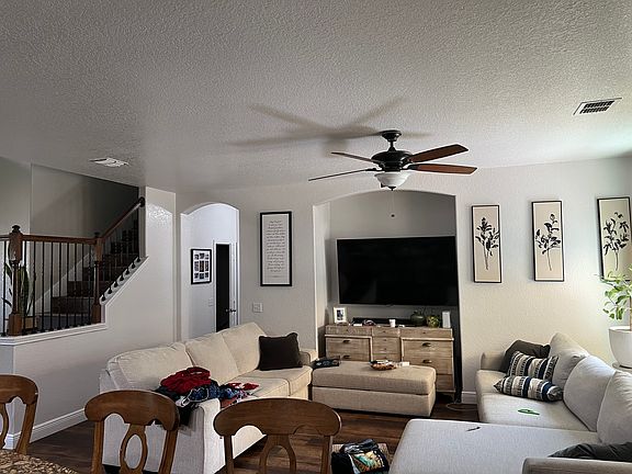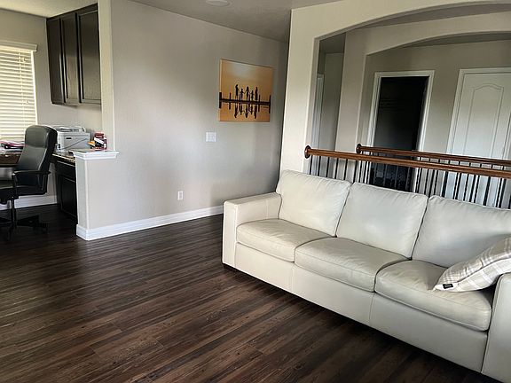 The layout includes one bedroom and a full bathroom downstairs, while upstairs you'll find three bedrooms, two bathrooms, an office, and an additional den. The house features nine-foot ceilings throughout and includes a two-car garage. All appliances are also included.