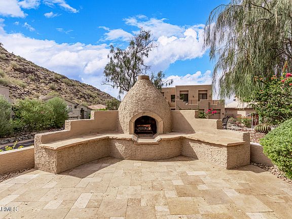 This N. Central Phx, GATED remodel boasts views from every angle, 20-foot beamed ceilings in the family room, with a fireplace & a wrap around patio w/mountain vistas overlooking a lush grassy area. Enjoy a 2nd fireplace outdoors with city & mountain views. The main level features a large office with its own entrance, perfect for working from home, or using as a 4th bedroom. Upstairs, you'll find two bedrooms, one with a private balcony, connected by a Jack and Jill bathroom. The owner's suite offers a private balcony, a spacious walk-in closet, and a luxurious bath area.
