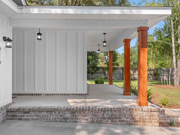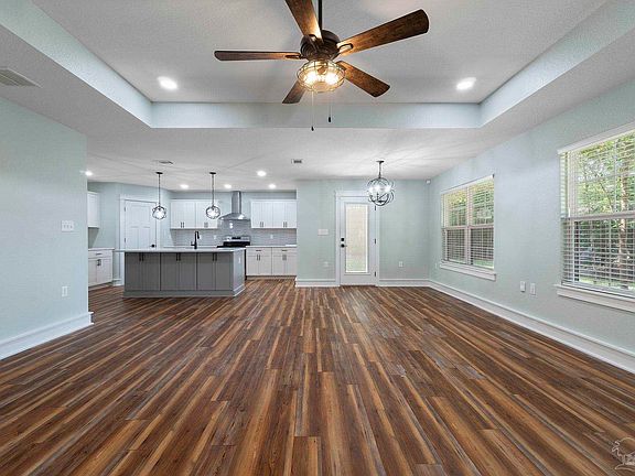 This beautifully custom-built home offers comfort, style and smart functionality from the moment you arrive. A turnaround driveway makes entry and exit effortless, while the welcoming country-style front porch invites you to sit back and relax. Step through the elegant front door into a warm foyer featuring wood shaker-style walls and a tray ceiling. Throughout the home upgraded light fixtures and six ceiling fans enhance both aesthetics and comfort. To the right two spacious bedrooms are separated by a full bath with quartz countertops and dual sinks. A privacy door encloses the tub/shower and the toilet area making it ideal for shared use. Flooring throughout is a mix of durable LVP and tile. Continue into the open concept family room, where a raised ceiling and wood accent wall create a cozy yet spacious atmosphere. The openness keeps you connected to the kitchen, which features Whirlpool appliances – bar including a smooth-top stove with five burners and a multifunction oven with self-clean, air fryer, and confection settings. Kitchen cabinets have soft closing doors and Quartz countertops. A breakfast bar has seating for four and a farmhouse kitchen sink with extra. The main bedroom is generously sized with a raised ceiling and leads to a luxurious en-suite bath. Enjoy an oversized linen closet, a large oval soaking tub with shower, and large vanity with double sinks and quartz countertop. A spacious walk-in closet and nearby laundry room add convenience. Upgraded black windows with wood blinds.
