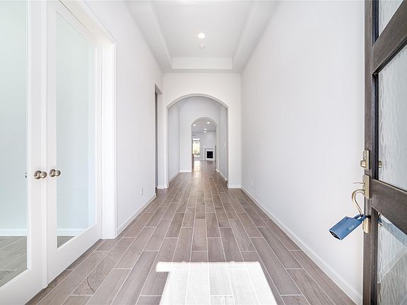 Spacious home office with French doors set at the front entry. A wide hallway with soaring ceilings leads to an open-concept kitchen, dining area, and family room. The kitchen offers a large center island with built-in seating, ample cabinet space, and a walk-in corner pantry. The dining area seamlessly connects to the family room, which features a wall of windows and an elegant fireplace with a wood mantel. The private primary suite boasts a double-door entry, luxurious bath with dual vanities, a garden soaking tub, a separate glass-enclosed shower, and two oversized walk-in closets. A private guest suite with full bath provides added comfort. The home also includes an extended covered patio, ideal for outdoor entertaining, a mudroom, and a two-car garage.
